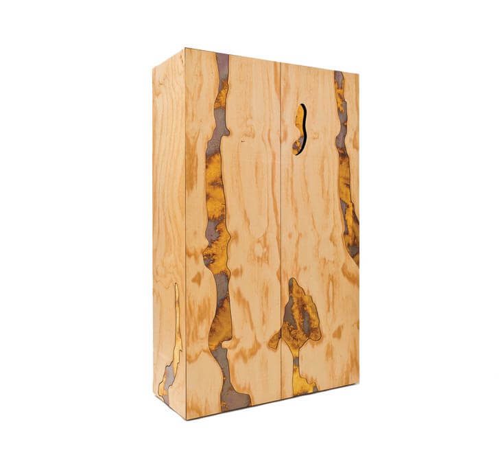 - Created in his Milan-based atelier for his 2013 solo exhibition at Galerie Italienne in Paris, Alberto Biagetti’s Triptych wardrobe was inspired by the sky “as a source of mind-expanding fantasy”. The design echoes the raw wood grain and is created using a solid pine construction with inlaid mirror and a polished brass trim. larcobaleno.com