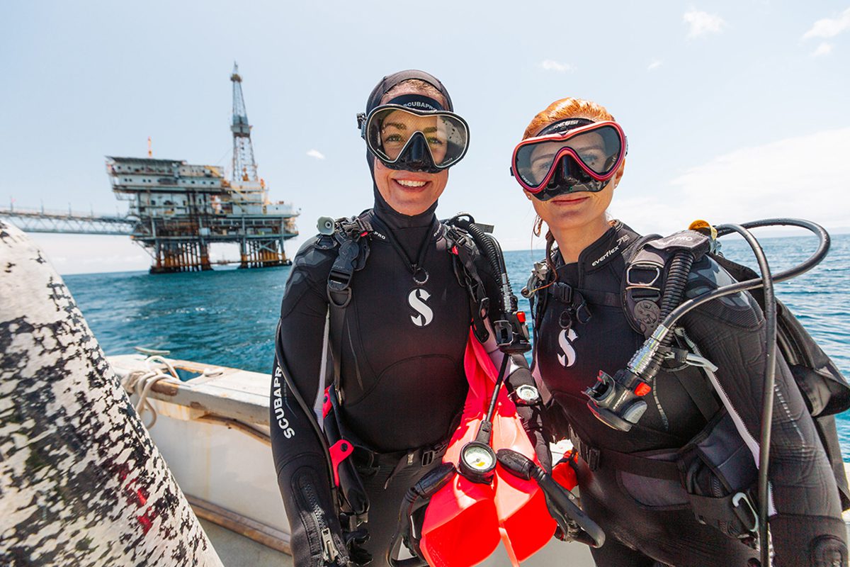 A man underwater wearing scuba diving equipment and a wetsuit, taking notes