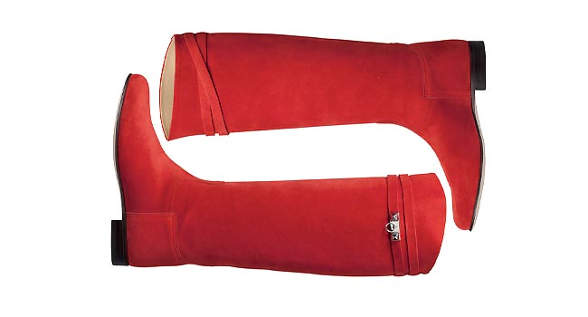 I want my shoes to embody personal style and creativity, pieces of art for your feet.Leg in suede black boot against a background of white and red stripes and lights